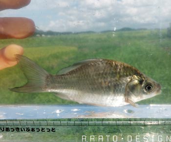 カダヤシをはじめギンブナ、ヘラブナの幼魚、モツゴ、ギンブナ、小さなコイの幼魚が釣れました。
