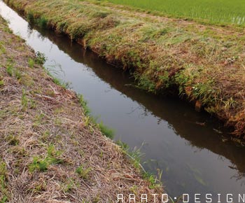 さて、日が傾き次の場所が本日最後ポイントになりそうです。田んぼの排水の影響を受けにくい川の上流部に向かいます。本日のメインステージと予想していた場所に到着しました。川を覗き込むと・・・・雰囲気は非常にいいです。タナゴ類もいそうです。・・・・・しかし、探せど探せど魚類の生体反応がありません。かなりの距離を歩いて確認しましたが、魚影が全く確認できませんでした。この時期だと少し深くなったよどみにフナやコイなどが入ってきていることが多いのですが、全くいないのです。それとちょっと気になったのが、田んぼによってタニシやオタマジャクシが沢山いるところと、全くいないところの差が激しいのです。これは使用農薬や農法の違いによるものなのでしょうか?川に魚が上がってこない理由が、堰や水門などの物理的遮断によるものなのか、それとも農薬などによるものなのか、ただ単に、たまたまその日にいなかっただけなのか・・・・・・・。米作りについて知らなさすぎるため、農業体験などを一度してみないといけませんねぇ・・・・・なぜ魚がいないのかサッパリ分かりません。こうして本日の大本命の場所では、竿すら出さず終了いたしました。