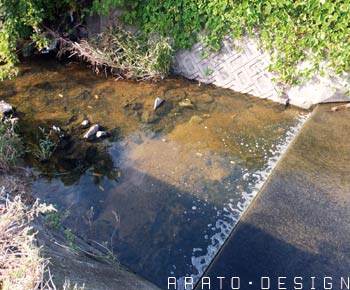 2箇所目のポイント。味気ないコンクリート水路が合流するところに小さな堰の落ち込みが。ここに沢山の小魚が確認できました。